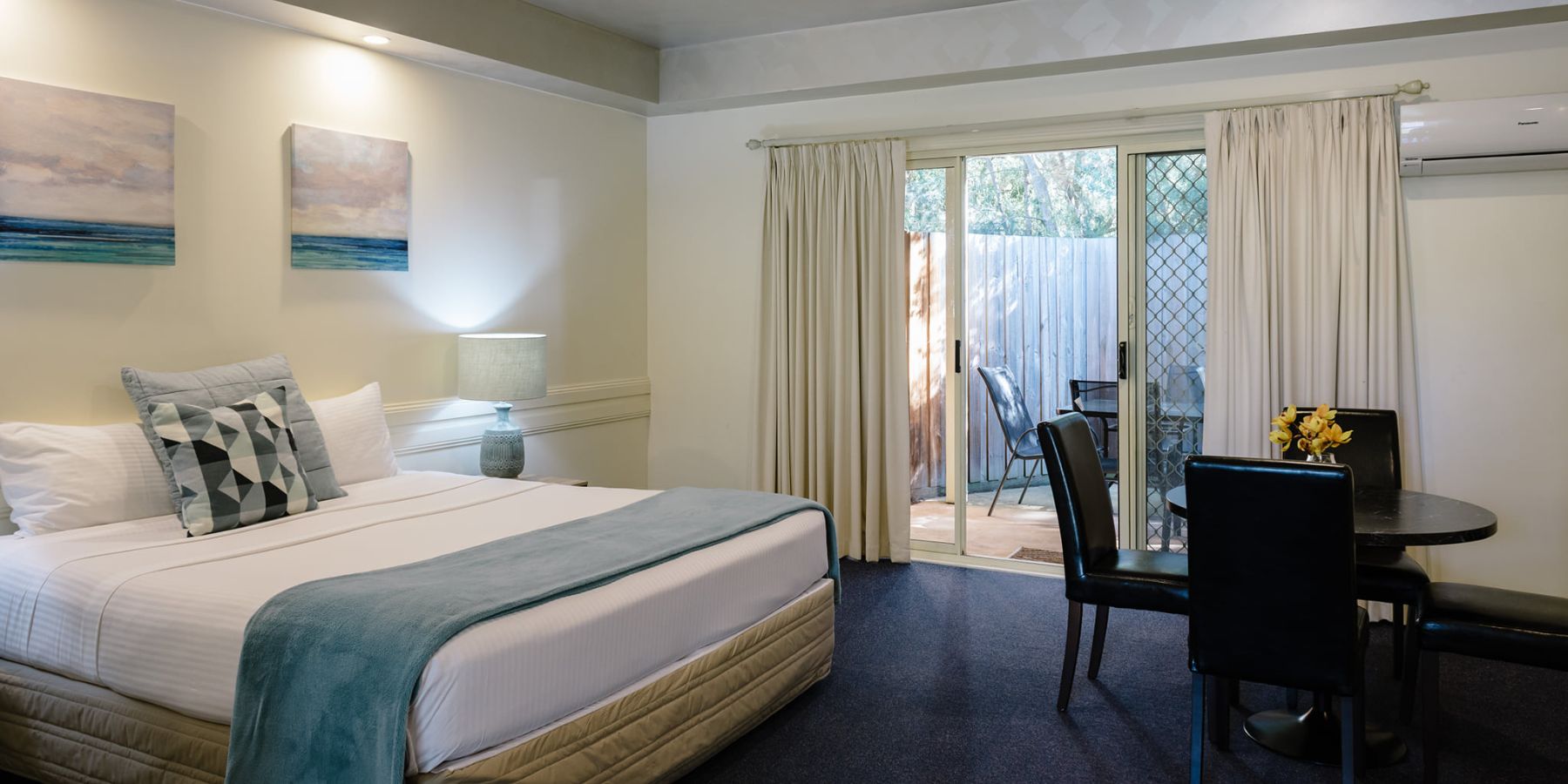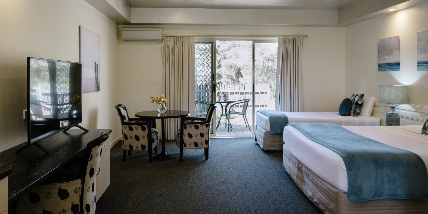 The Two Bedroom Suites (or family suites) are perfect for groups, colleagues and families in need of a little more space. Park in front of your room and enter your spacious room with King size bed, walk into the second bedroom complete with two single beds. These suites also feature flat screen smart television, microwave, toaster, kettle, fridge, heating/cooling, modern coastal decor and a large private courtyard. For families with three or more children please speak to us about how we can make these rooms work for you.